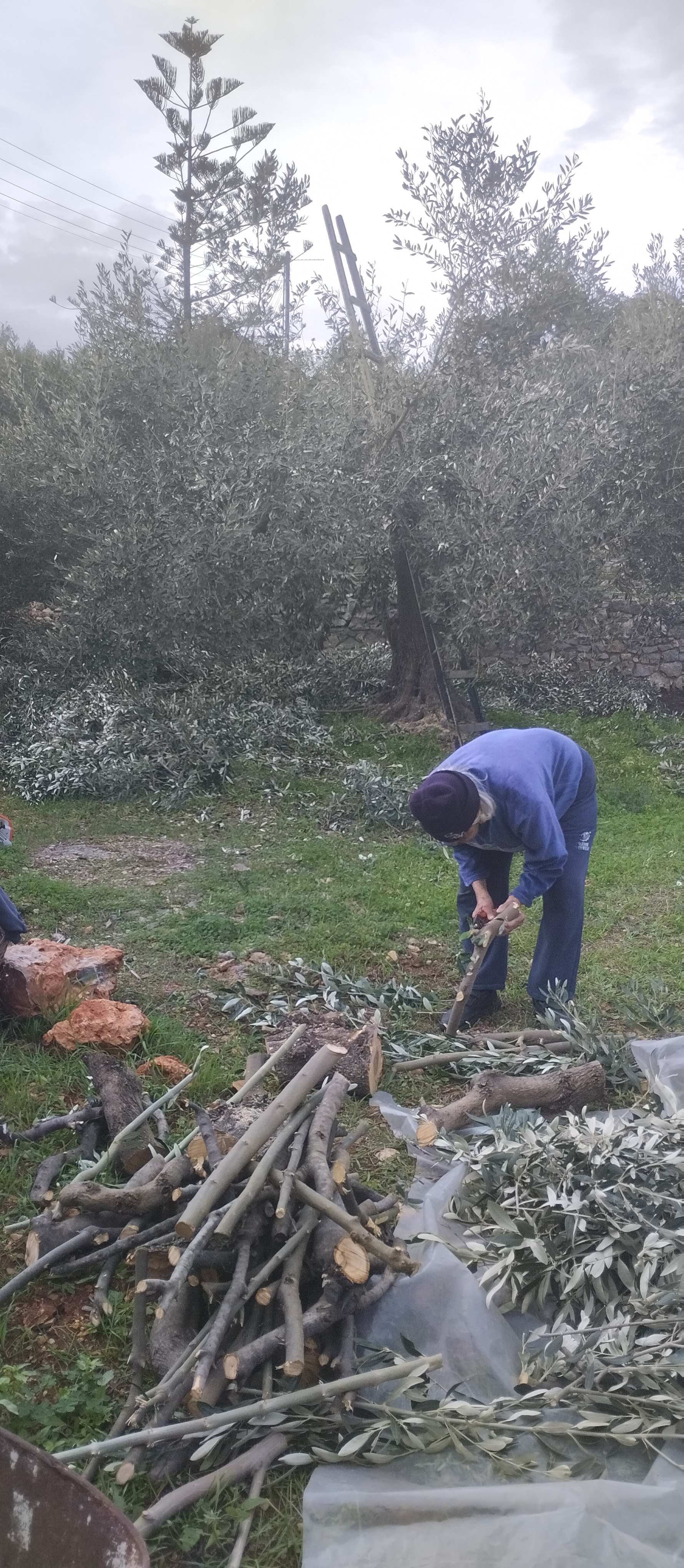 Here is Vaso with her trusty shears (secateurs), bent over, snipping and cleaning the twigs from fallen branches. She is happy still, at 85, to be able to help.